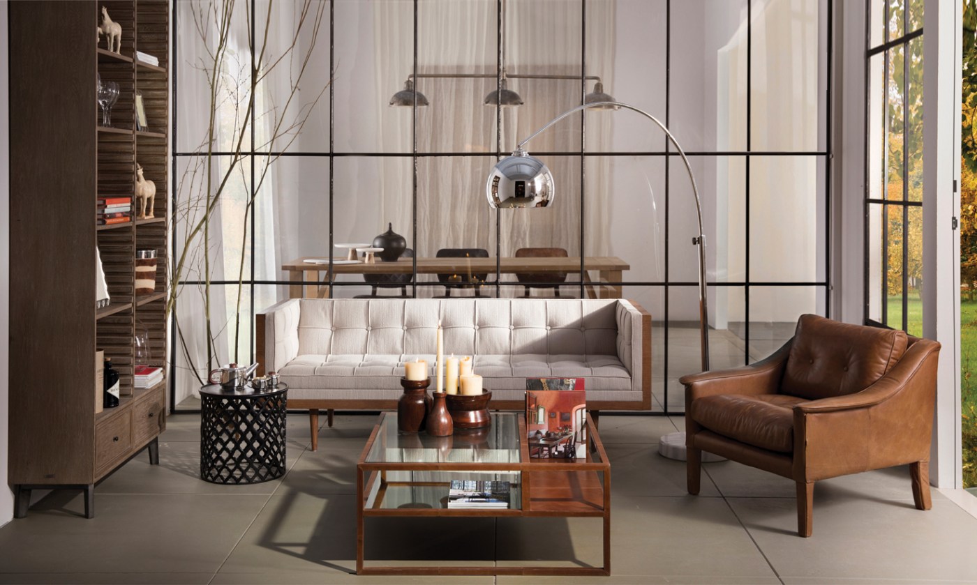– coffeetable Damian : metal frame with camel-brown leather and mirror and glass top