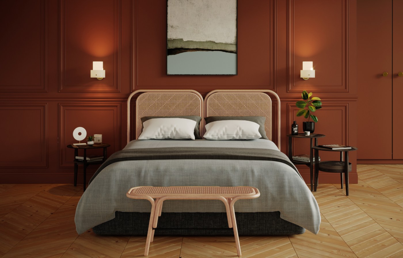 “Passage” is a natural rattan composition playing with hollow or solid surfaces. Intertwined frames are giving to this headboard a sense of lightness, as if drifting in the air. Started like an artwork from sketch with outlines and forms, it eventually evolved into a real product with a function. The outside frame where a clamplamp can be fixed is holding the inside headrest in open webbing.