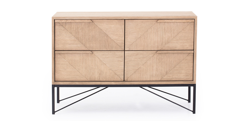 project13bCommode Oscar is made with 3mm thick oak veneer in the front of the drawers. This veneer is brushed to enforce the lines in the wood. By placing this in different directions a pattern is made, very subtle with just changing the direction of the wood. The handles are designed as a part of this pattern. The metal lower part reflects like a mirror the lines from the upper part, connecting this solid body on top with the fine metal construction below.